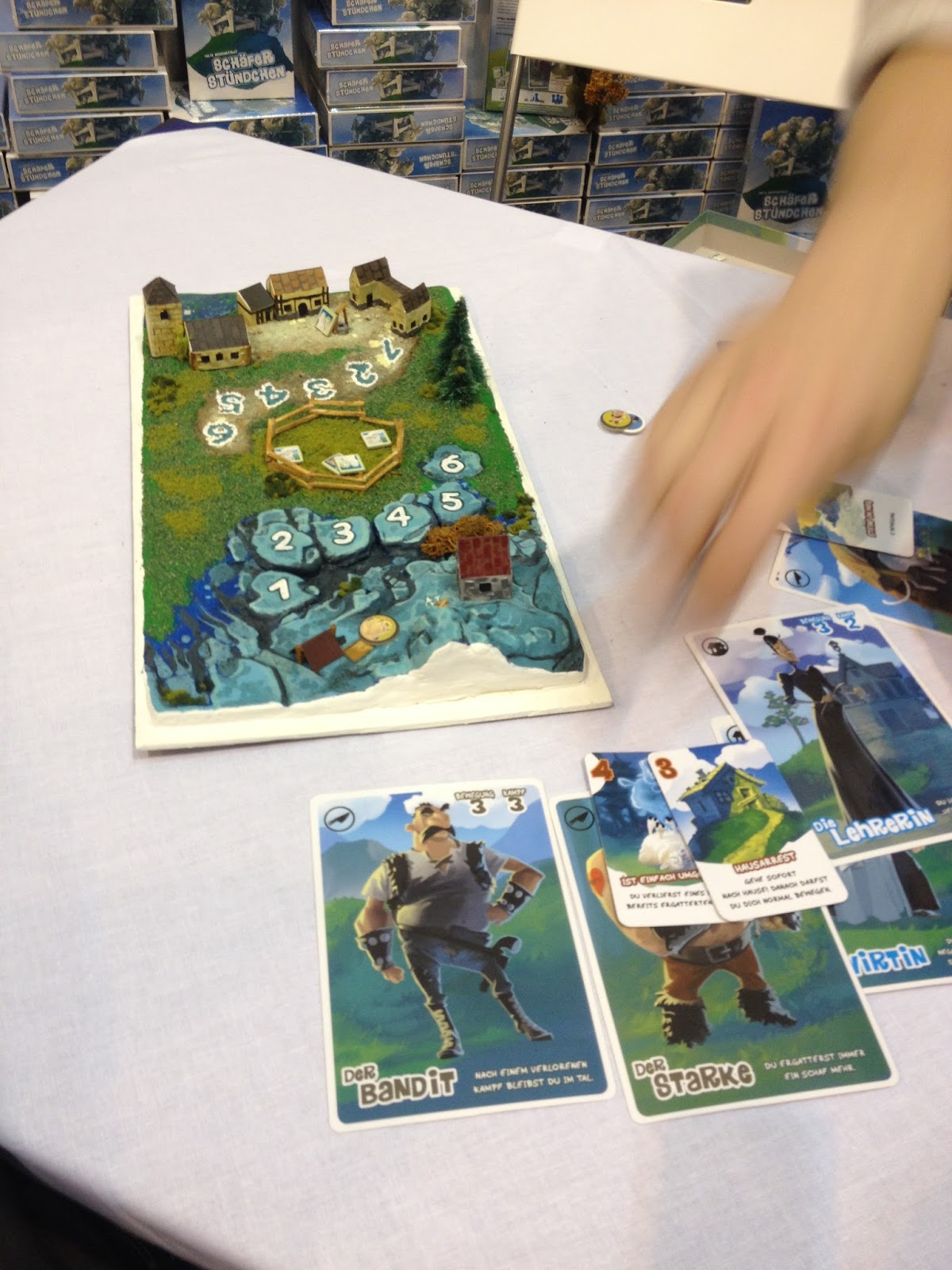 Hier hat uns eigentlich nur die zugegebenermaßen originelle Standpräsentation hingelockt. Voller Hingabe und Leidenschaft wurde uns dieses unbekannte Spiel des Comic-Zeichners Felix Mertikat angepriesen. Schließlich haben wir uns dann auch zu viert zu einer Probepartie überreden lassen. Es geht darum, dass sich zwei Teams (Banditen und Dorfbewohner) einen Wettlauf zum Schafsgatter liefern, bei dem das Ziel ist sich die meisten Wollknäule auf vier Beinen zu sichern. Dumm nur, dass auf dem Weg zum Ziel einem die Mitspieler immer wieder in Form von Karten Knüppel zwischen die Beine werfen. Man spielt immer eine (hoffentlich positive) Karte auf sich selbst und eine zweite (negative auf das andere Team oder positive auf Partner) auf einen beliebigen Mitspieler. Dadurch verändern sich die Lauf- oder Kampfpunkte die wichtig werden wenn zwei Spieler gleichzeitig am Gatter ankommen um die Besitzverhältnisse zu klären.
